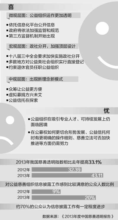 中民慈善捐助信息中心9月22日发布的《2013年度中国慈善透明报告》显示,2013年我国慈善透明指数为43.11,相比去年提高33.1%,但整体仍偏低;约20%受访公众对公益慈善组织信息披露工作感到比较满意,而去年只有9%;约70%的公众认为信息披露工作有一定程度进步。